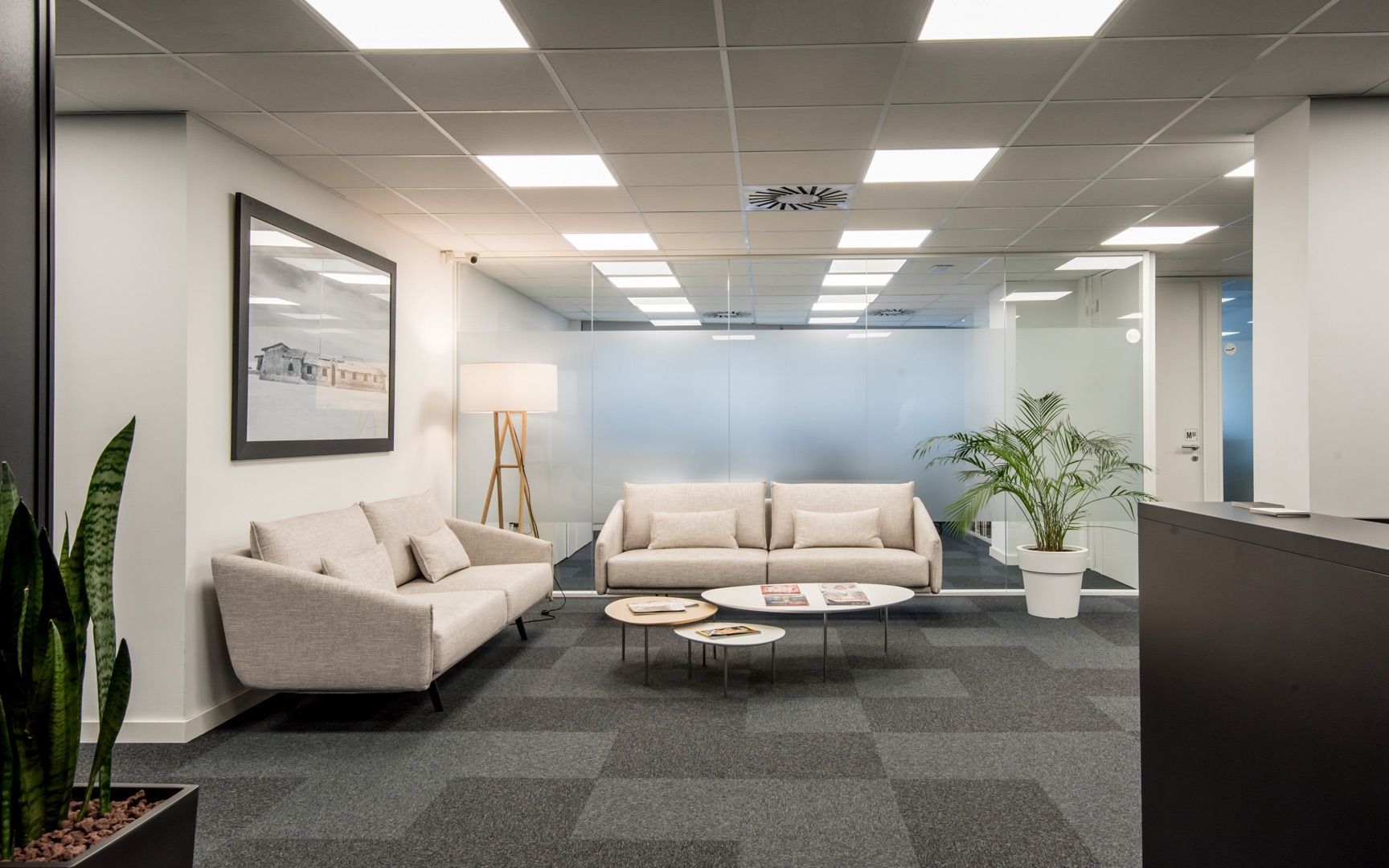 Grandes y cómodos espacios comunes, recepción y zona de espera, en acorde con todo el proyecto. Pavimento en moqueta, cuidando la acústica en toda la superficie de las oficinas.
