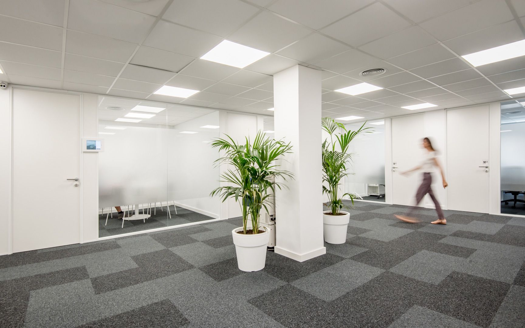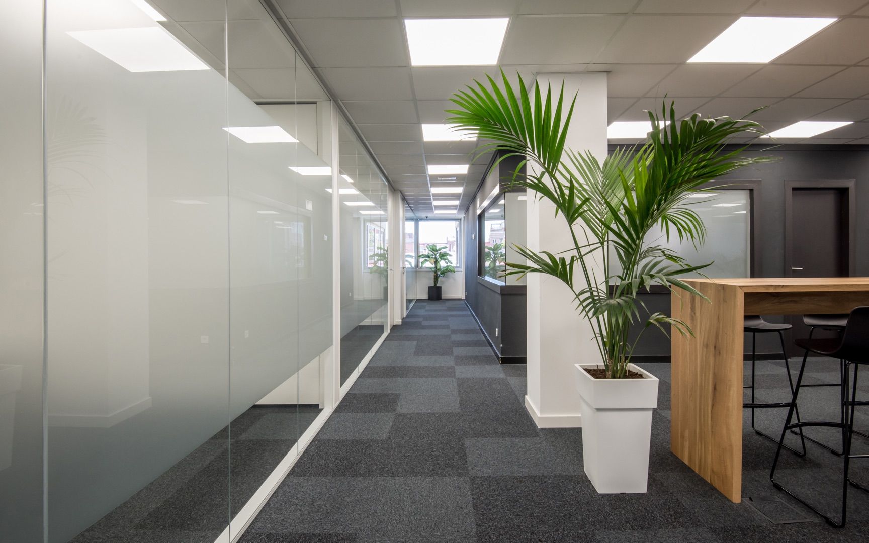 Despachos privados con divisiones acristaladas que regulan las visuales en relación con la privacidad de cada estancia. Control de acceso personalizado e iluminación led garantizando la luz necesaria en cada puesto de trabajo.